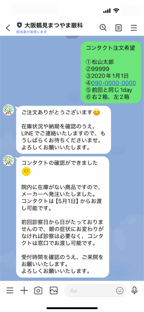 - 当院でコンタクトレンズ処方歴があり、前回と同じ種類・度数を購入する場合のみ、「コンタクトかんたん注文LINE」でご注文いただけます。