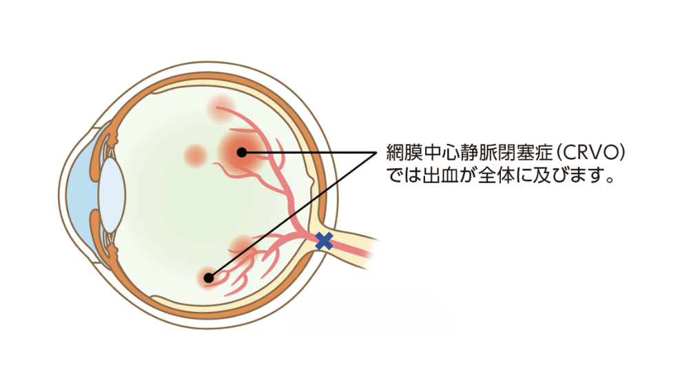 すべての静脈の枝が集まって一本の太い「幹」となる根元の部分(視神経乳頭部)で閉塞が起こるタイプです。根元が詰まるため、血液のうっ滞は網膜全体に及び、BRVOに比べてはるかに広範囲な眼底出血や網膜浮腫を引き起こします。そのため、症状は重篤になることが多く、視力も0.1以下まで著しく低下するケースが少なくありません。