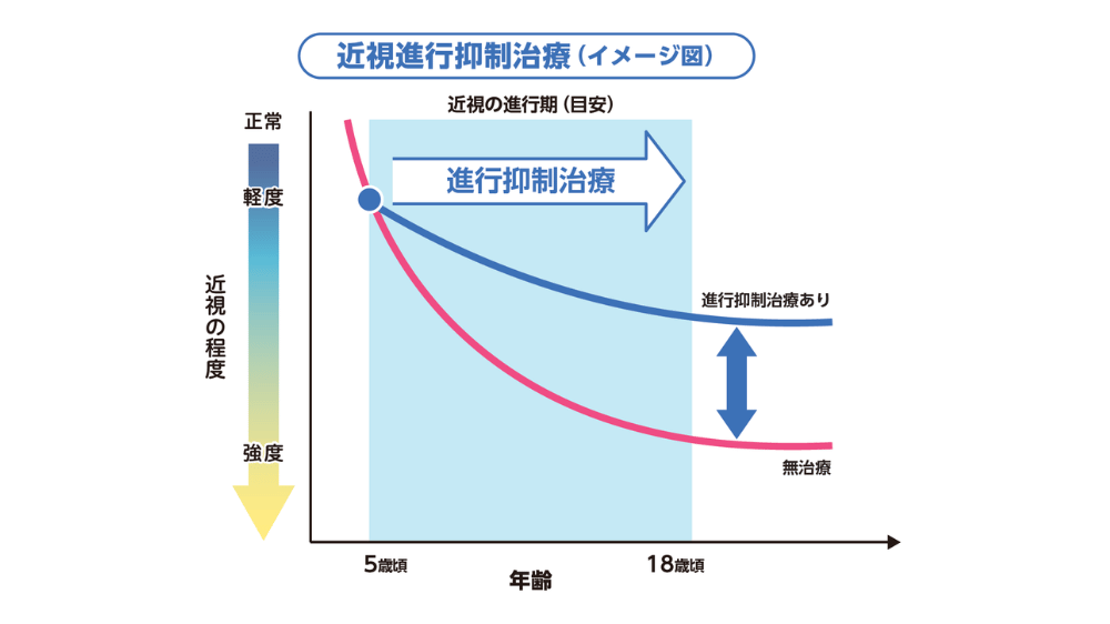 近視は子どものときほど速く進む可能性があります。早い段階からできるだけ近視が強くなるのを避けることで、将来の見え方を守り、目の病気になる可能性を低下させることが治療の目的です。