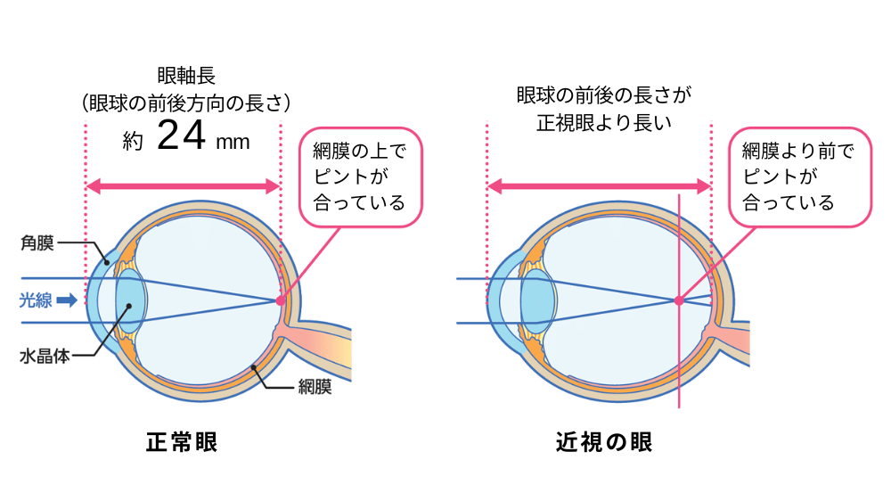 子供の近視は、主に眼球の奥行き(眼軸長)が伸びてしまうことで、ピントが網膜の手前で合ってしまう状態です。そして、一度伸びてしまった眼軸長は元に戻りません。