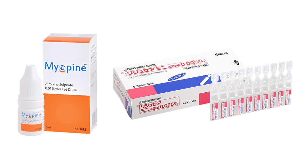 マイオピンはアトロピン0.01%、リジュセアミニはアトロピン0.025%を配合させた点眼薬です。アトロピン0.01%は、オーストラリアと中国で「小児における近視の進行抑制」の適応で承認されています。リジュセアミニ0.025%は、日本において厚生労働省により承認されています。