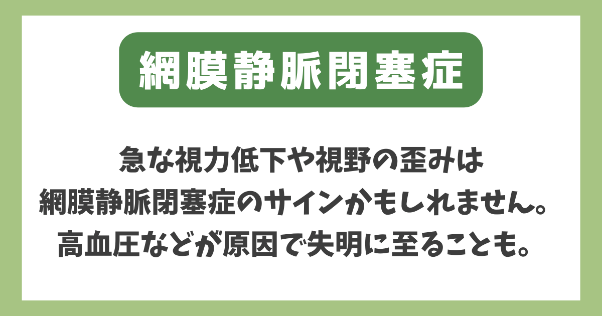 - 【症状】急な視力低下、かすみ目、視野の一部が欠けるなど。